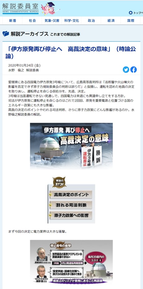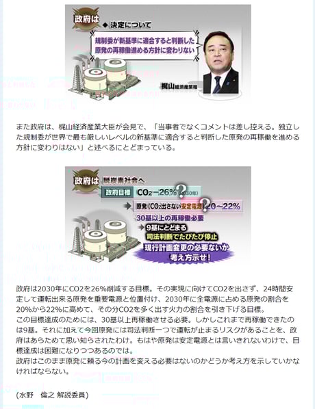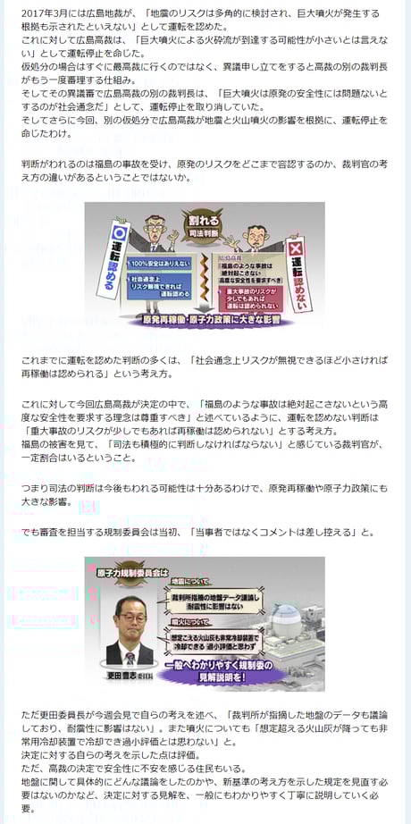 解説委員の水野倫之氏は、「原発には司法判断ひとつで運転が止まるリスクがあるので安定電源とはいえないから脱原発を」「政府、原子力規制委員会は判決を謙虚に受け止めろ」等の暴言を吐き、亡国へ思想誘導した。放送法第四条違反だ。