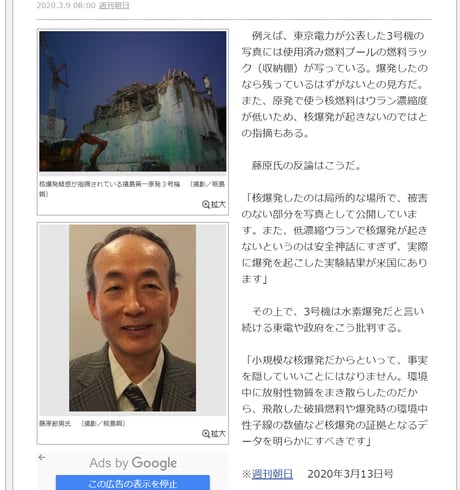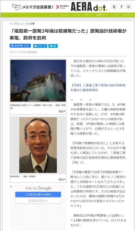 「3号機で核爆発が起きた」と主張する原発技術者は何人かいる。そのなかで最も詳しく解説しているのが、三菱重工業で原発の設計技術者を務めた藤原節男氏(70)だ。