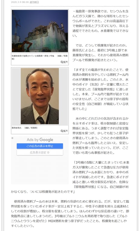 では、どうして核爆発が起きたのか。藤原氏によると、最初に3号機上部で水素爆発が発生し、それから使用済み燃料プールで核爆発が起きたという。