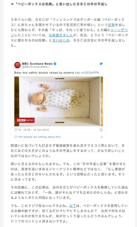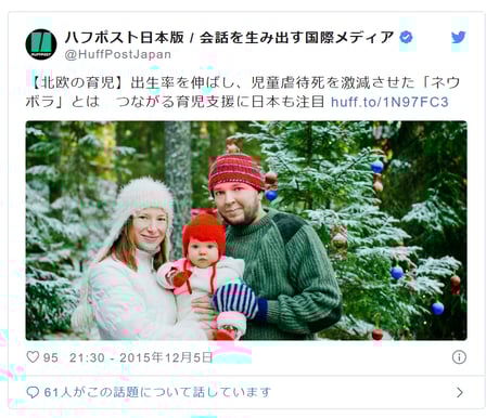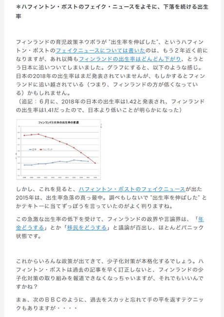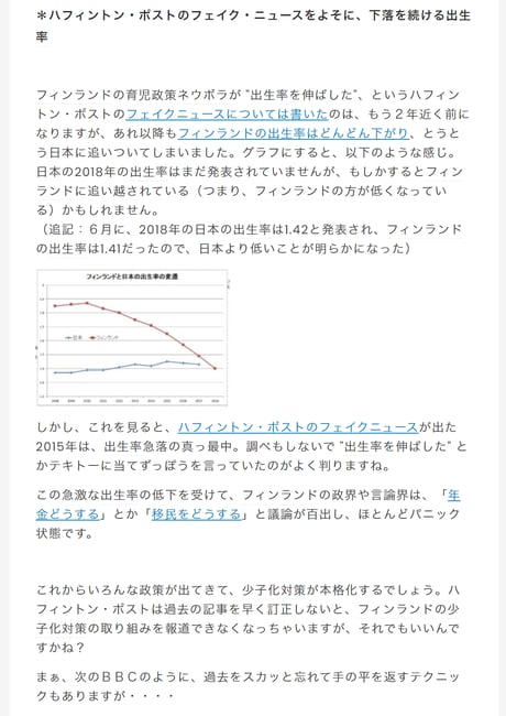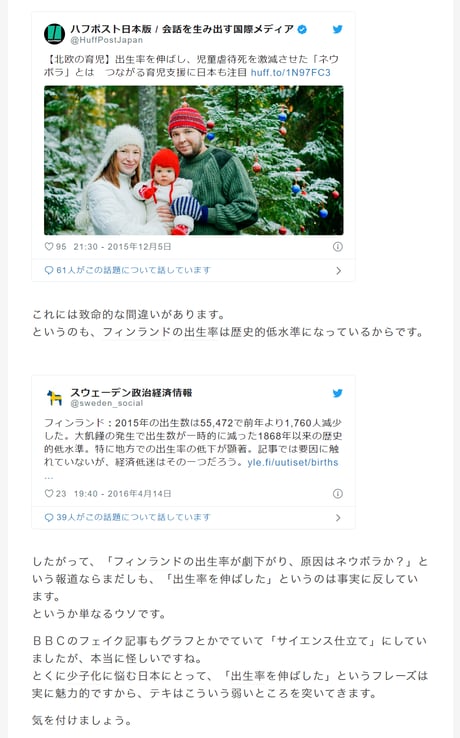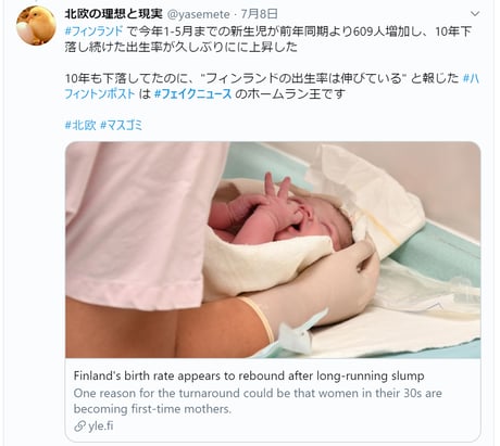 私のブログにあるように、ネウボラは出生率を上げるための仕組みでは無く、そのためネウボラが出生率を上げることはありません。この点ハフポストを非難してもいいかもしれませんね。「ネウボラ」を誤用されたフィンランドにとっても迷惑でしょうからhttps://t.co/oH6ZkOAvI9