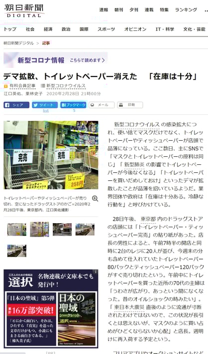 つまり、朝日新聞をはじめとするマスコミが、有りもしないSNSのデマを捏造して報じたせいで、「トイレットペーパーの不足」という現実が生み出されたことになる。