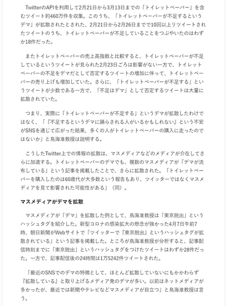 「トイレットペーパーが不足するというデマ」がデマだった。
