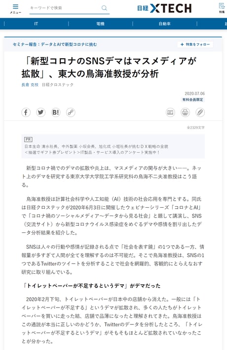 Twitterのデータを分析したところ、「トイレットペーパーが不足するというデマ」がそもそもほとんど拡散されていなかったことが分かった。(日経XTECHより引用)