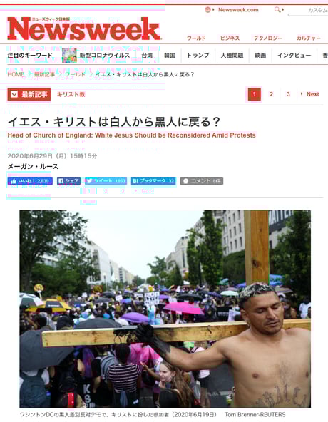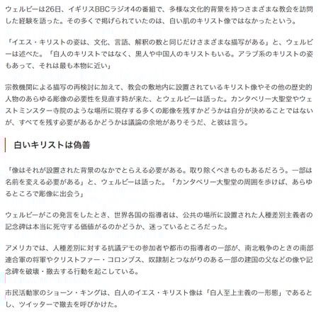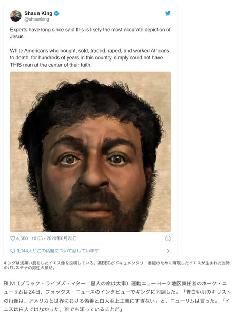 世界で人種差別に関わる像や記念碑の撤去が広がるなか、ついにイエス・キリストを白人として描く肖像の見直しを英国国教会の大司教が指示したhttps://t.co/z7JiSmAZIo