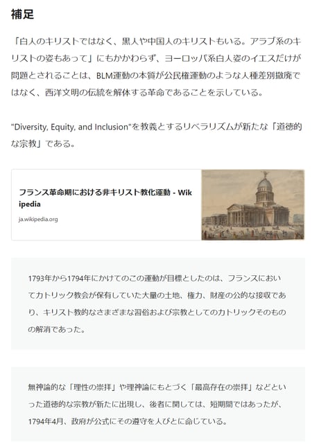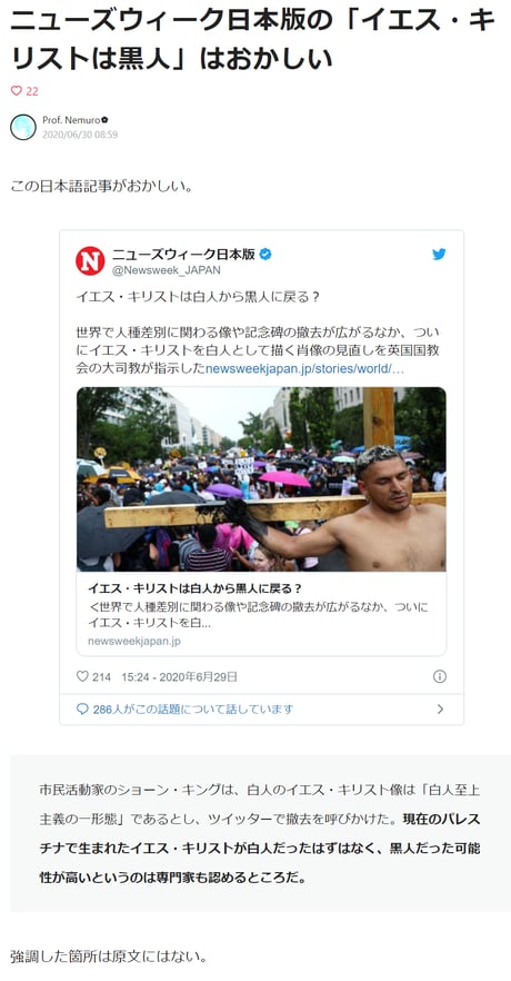 「黒人差別に対する抗議活動」に擦り寄ったのか、原文には無い「(キリストが)黒人だった可能性」の一分。