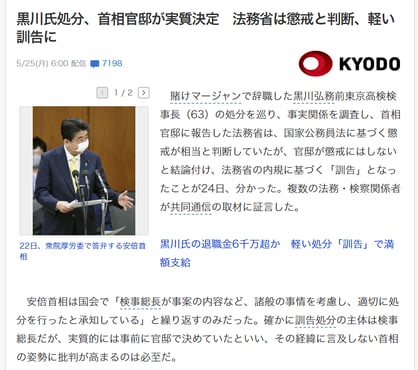 黒川氏は、官邸の意向で「懲戒」にせず、より軽い「訓告」にしたと報道 → 安倍総理大臣「法務省の意向」 菅官房長官「官邸の関与はない」