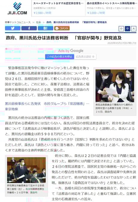 黒川氏処分、首相官邸が実質決定 法務省は懲戒と判断、軽い訓告に