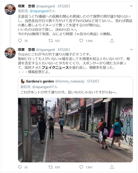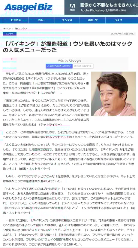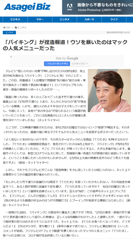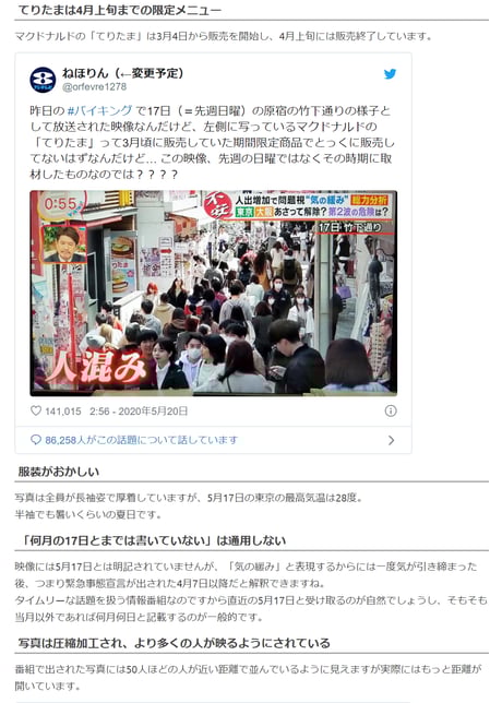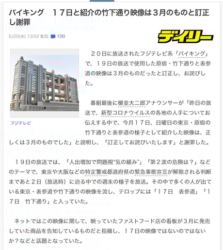 【実は3月のでした】昨日放送されたバイキングで原宿の映像について、ネットで「5月にしては不自然」との指摘をうけ、榎並大二郎アナ「昨日の放送で各地の人出にお伝えする中で今月17日の原宿の竹下通りと表参道の様子として紹介した映像は正しくは3月のものでした。訂正してお詫び致します」 pic.twitter.com/35HNybyUqp