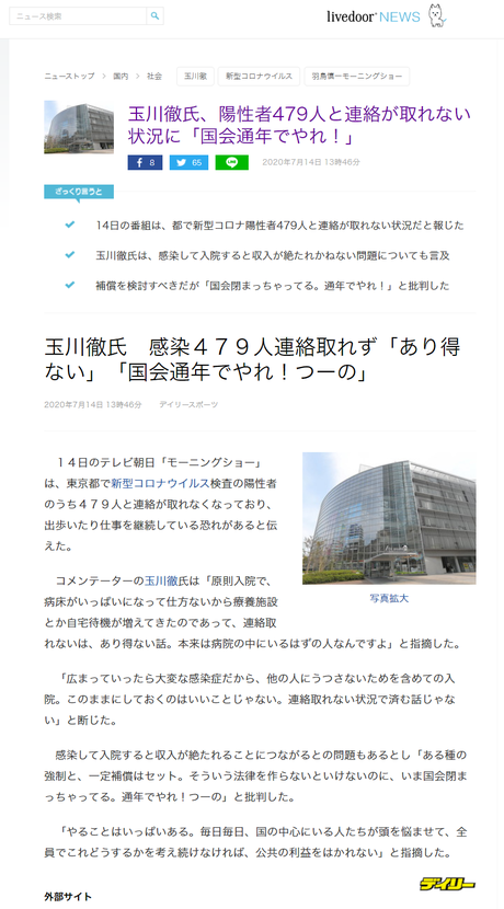 これを『デイリースポーツ』は、「東京都で新型コロナウイルス検査の陽性者のうち479人と連絡が取れなくなっており、出歩いたり仕事を継続している恐れがあると伝えた」と報道。