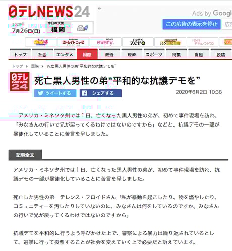 「平和的なデモ」なら、死亡黒人男性の弟が「平和的なデモを」なんて訴えないのでは?