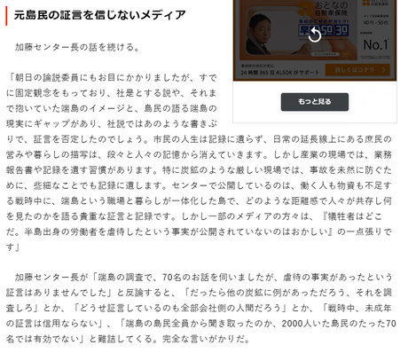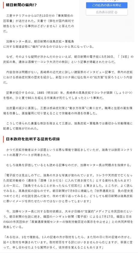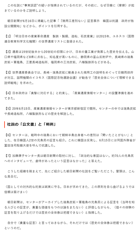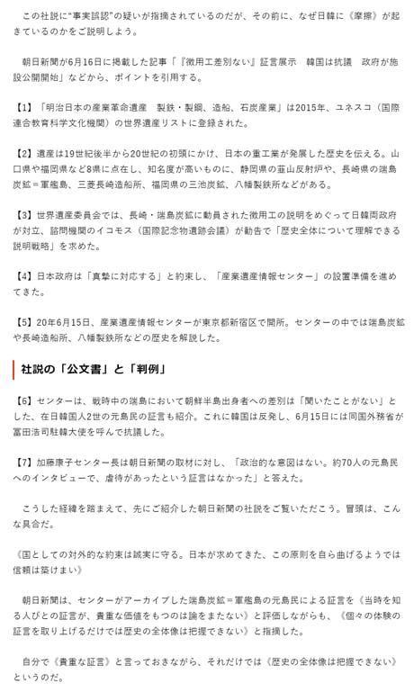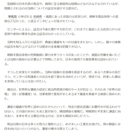 社説は、「朝鮮半島出身者への虐待がなかった」という元島民の証言の信頼性を全面的に否定すると共に、当時の新聞や管理企業の一次資料すら歯牙にも掛けない。にも拘わらず、韓国側の証言でしかない「苛酷な労働を強いた」ことを「政府の公文書などで判明した」と嘘を書いている。