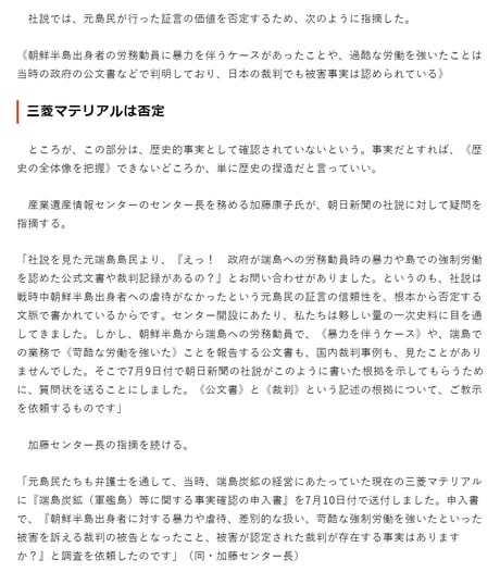虚偽でなければ、デイリー新潮や産業遺産情報センターの加藤康子センター長から求められた「公文書や判例」の出典がすぐに提示できる筈だが、未だに提示がないという。