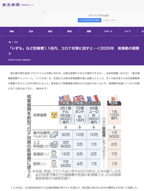 核兵器予算を新型コロナウイルス対策に回せば、必要な医療をどれだけ提供できるか―。非政府組織(NGO)「核兵器廃絶国際キャンペーン」(ICAN)が、米英仏3カ国の核軍備費を基に試算したところ、多くの命を救うための医療態勢を整備できることが浮き彫りになった。感染拡大で医療崩壊が懸念される国が少なくない中、軍事費を削減してコロナ対策に充てる国も出てきた。(柚木まり)
