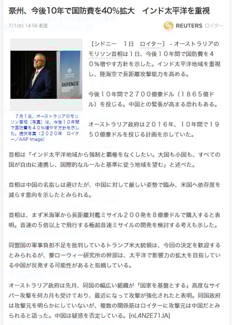 日本と同じ環太平洋国家のオーストラリアは、中国の脅威に対抗して「10年で国防費40%増」を発表している。