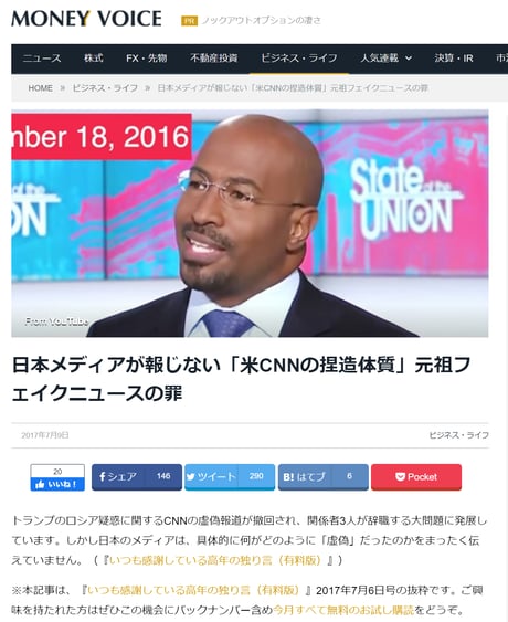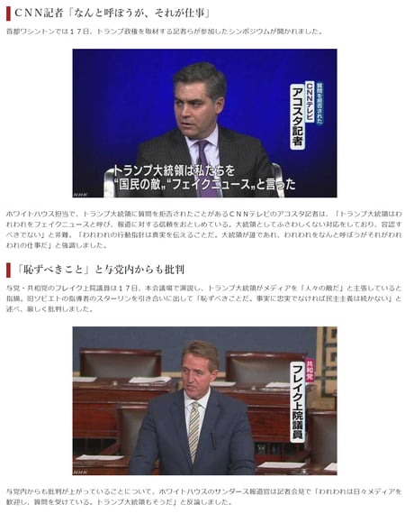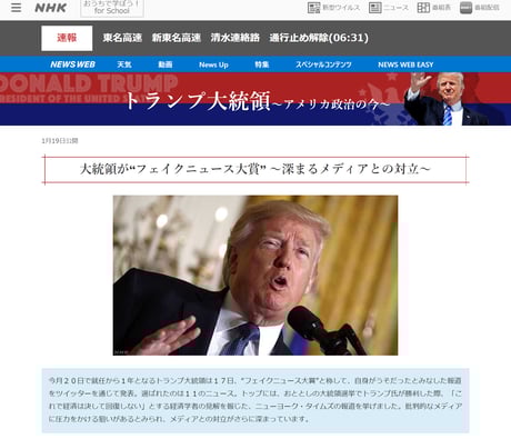 CNNの記事を「フェイクニュースだ」と非難するトランプ大統領のことを「『ウソ』を正当化するような異例の政権とどう向き合うのか。メディアも問われている。」と扱き下ろしている。