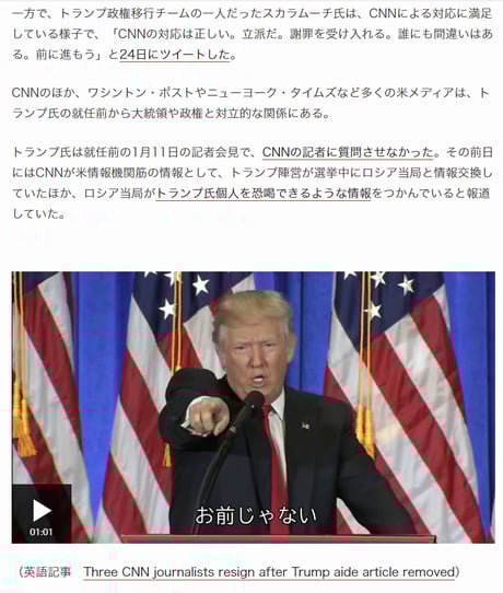 にも拘わらず、日本のマスコミは「3人辞職」を小さくしか扱わず、「トランプ大統領のメディア批判」が「メディアに圧力をかけるための言い掛かり」のように報じた。