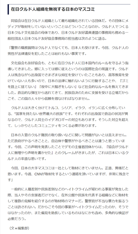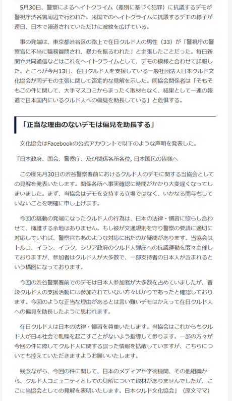最近ツイッターで話題となった、警視庁の警察官がクルド人に威圧的な職務質問をする動画についても抗議し「警察は差別を謝れ」と訴えた。