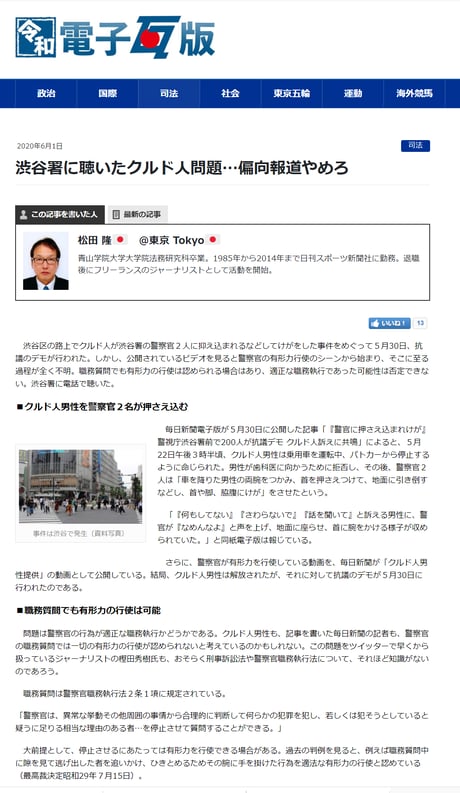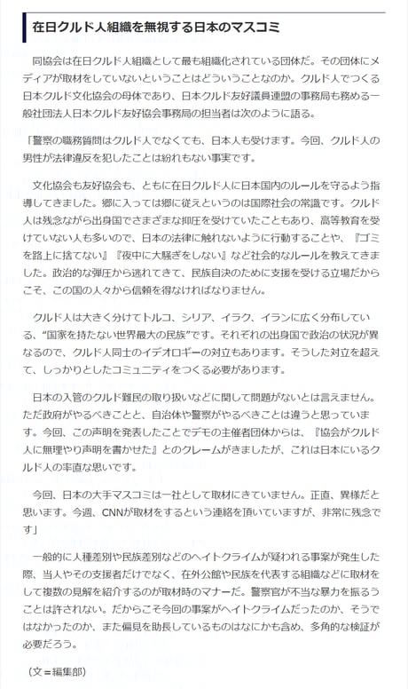 毎日新聞の悪質なところは、動画に至る経緯を報道せず、また日本にあるクルド人協会にも一切取材せずに、強引に「人種差別」に結びつけて「日本人や警察との対立を煽る」極左過激派やテロ組織のような手法にあります。