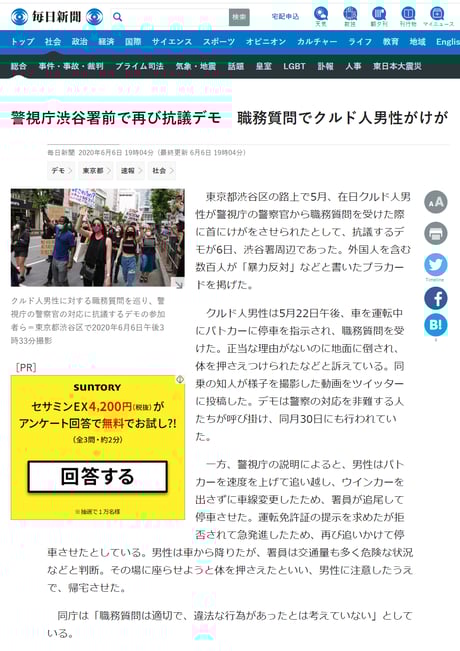 毎日新聞「「警官に押さえ込まれけが」 渋谷署前で200人が抗議デモ クルド人訴えに共鳴」