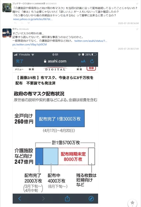 今回話題になっている配布は、すでに介護施設等へ配布が決まっていたもの。発送が遅いのは、厚労省の仕事が遅いからで、市場にマスクが出回るようになったからと言って、「発注契約の残り」を打ち切ることなんかできない。
