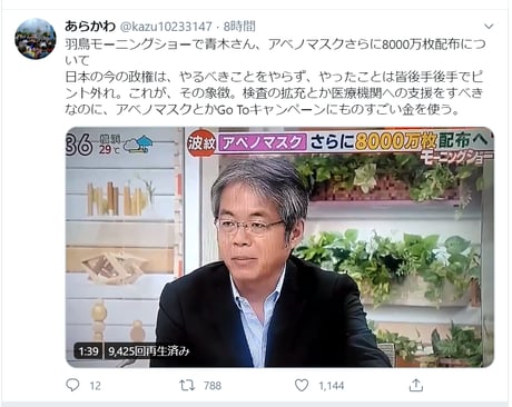 羽鳥モーニングショーで青木さん、アベノマスクさらに8000万枚配布について