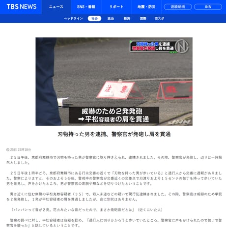 一般の通行人を殺傷しようとして刃物を持っていた犯人に、警察官が襲われ警告発砲した事件を伝える報道