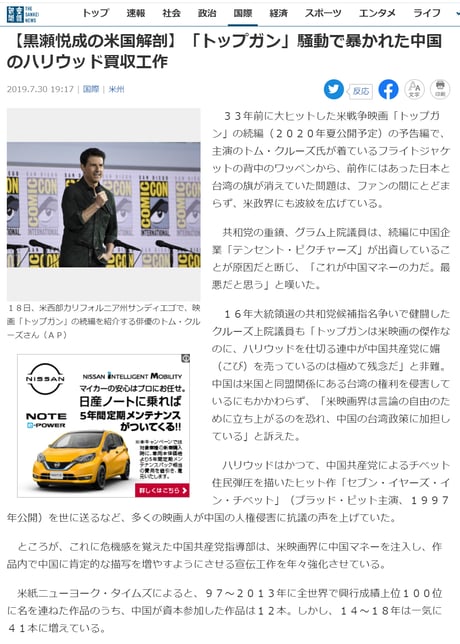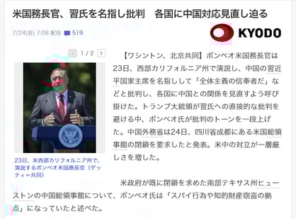 ポンペイオ長官が列挙した「中国共産党による違法行為や侵略性」をまったく報じず、単なる中米の領事館閉鎖合戦によって米国側が習近平へ誹謗中傷しているだけ、のように受け取れる記事。