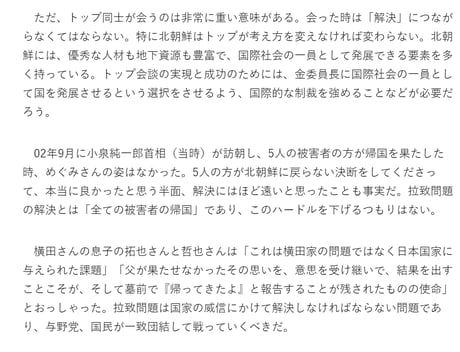 拉致問題の解決は、これからの国家としてのつきあいをどうするかも見据えて、将来性のあるものでなければならない。拉致だけ見れば日本は被害者であるが、北朝鮮には北朝鮮の言い分・考えもあるだろう。今後100年・1000年を見据えて、国家間をどうしていくのかの知見を示して欲しいものだ。安倍首相を持ち上げているところからすると、無い物ねだりかもしれないが。