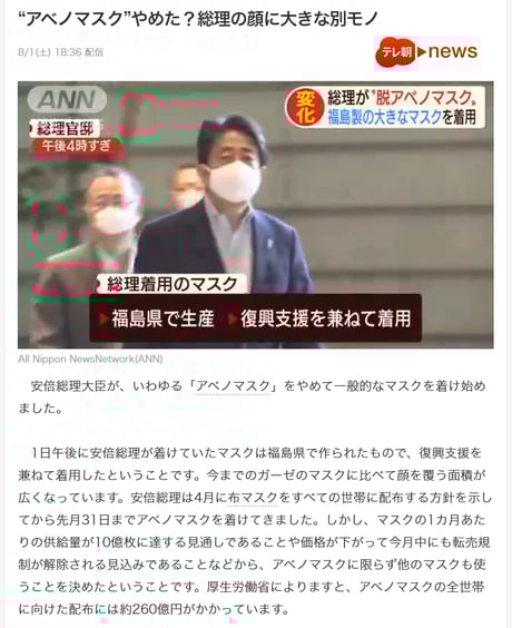 1日午後に安倍総理が着けていたマスクは福島県で作られたもので、復興支援を兼ねて着用したということです。今までのガーゼのマスクに比べて顔を覆う面積が広くなっています。安倍総理は4月に布マスクをすべての世帯に配布する方針を示してから先月31日までアベノマスクを着けてきました。しかし、マスクの1カ月あたりの供給量が10億枚に達する見通しであることや価格が下がって今月中にも転売規制が解除される見込みであることなどから、アベノマスクに限らず他のマスクも使うことを決めたということです。厚生労働省によりますと、アベノマスクの全世帯に向けた配布には約260億円がかかっています。