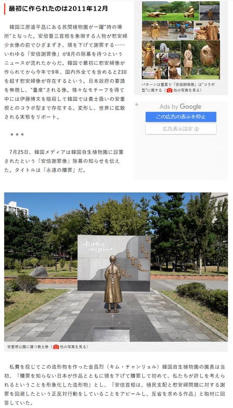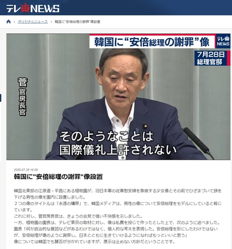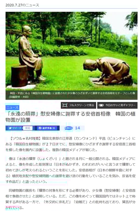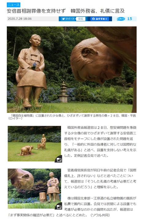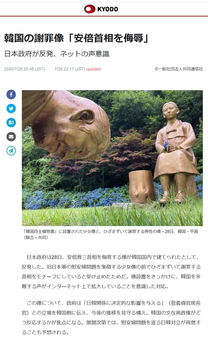 「像設置は4年前」なので「像設置を切っ掛けとした韓国批判の拡大」はフェイク。「インターネット云々」は、「SNSごときで軽々と動く安倍政権」との印象操作だろう。