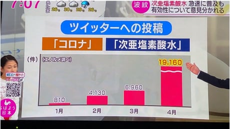 海外で次亜塩素酸水を散布する映像を流しても、「消毒液」とぼかし「次亜塩素酸水」とは報じない。また、国内の研究機関での有効性を示す研究発表や畜舎などでの使用実績を報じずに、安全性に疑問を持たせるような報道を行なっている。