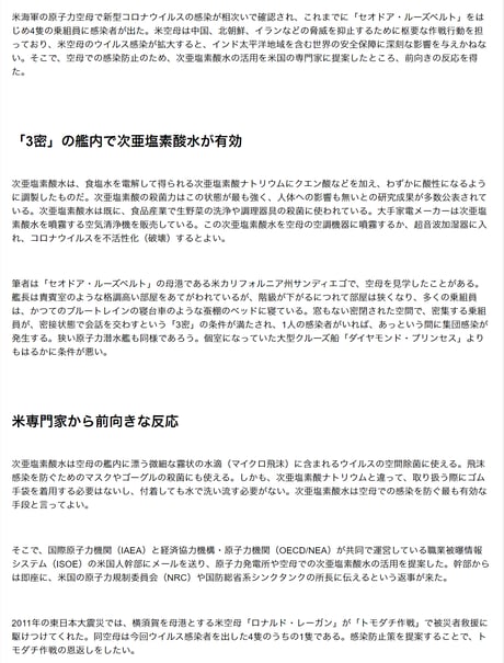 米空母の「3密」の艦内での次亜塩素酸水の噴霧が有効だという記事。噴霧による健康被害や副作用についての報告もないとのこと。