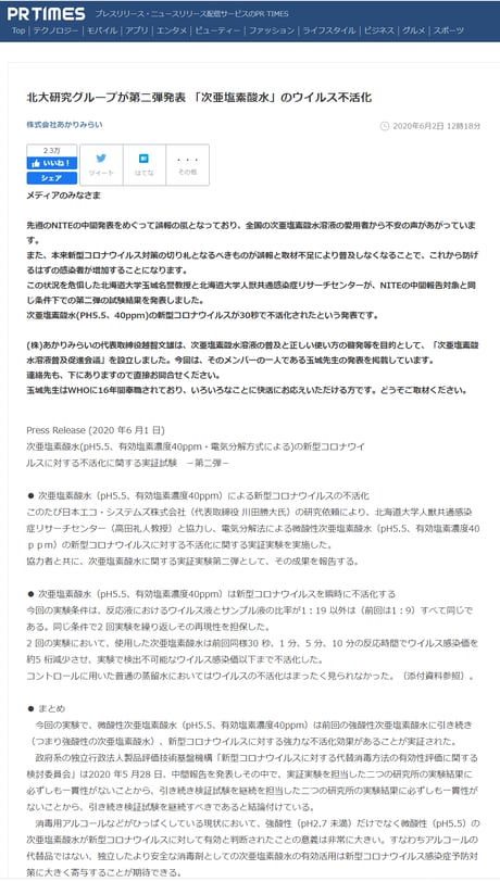 報道は次亜塩素酸水の殺菌効果について、長年、研究されている三重大学の福崎智司教授の著書から継ぎ接ぎ引用をしているが、超音波加湿器に依って生じる微細液滴径や、除菌効果(固体表面に付着したウイルス)の減少などについて効果があるとした第7章は引用していない。同章76ページには、人体に影響ないと明記されている。この箇所こそファクトシートに記載すべき内容であり、福崎先生は「有識者の皆様が次亜塩素酸水の十分な知見をお持ちではない」とのご意見である。