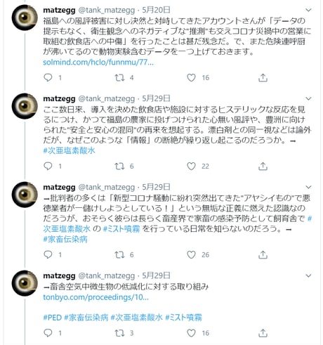 彼らが今すべきなのは風評の流布ではなく「20年以上に渡る噴霧による畜産業(飼育員)の被害実例」と今後深刻な熱中症も想定される台風や水害時の避難所に於ける具体的且つ効果的な「感染抑止対策」の提示、「ワクチンの完成」です。https://t.co/w6r4S9r2yv