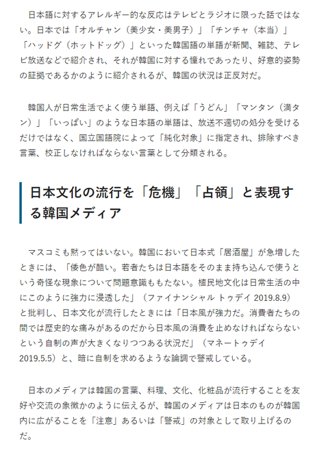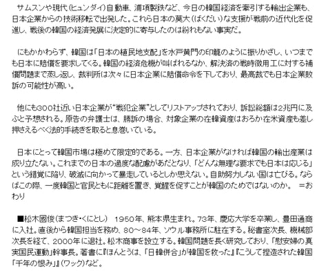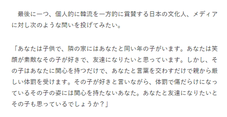 韓国は日本と似た文化を持ち、観光や土産などは日本から取り入れたもので、日本的な価値観が発展に寄与してきたと述べた。しかし、文在寅大統領はそうした自国の経済成長の過程を評価せず、日本に支配された側面を強調している現状を憂慮。両国の関係改善に向けて、これまで築かれてきた関係を虚心坦懐(たんかい)に見つめ直すことが大切だと指摘した。
