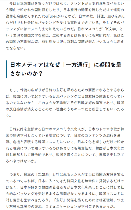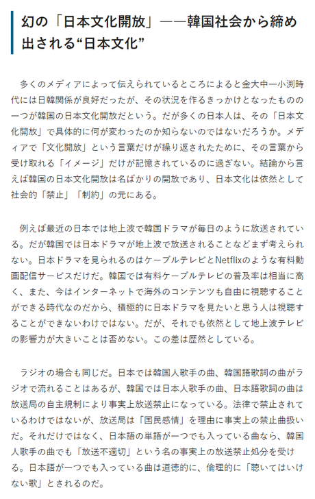 日本では韓流ドラマ毎日のように放送されているが、韓国では未だに地上波テレビで日本ドラマや日本語歌詞の曲など放送が制限されている。「これまで韓国によって築かれてきた関係」は、一言で言えば「韓国の反日・嫌日・侮日姿勢によって、恩を仇で返され、身に覚えのない罪を擦り付けられ、一方的に誹謗中傷され続けてきた」関係だ。虚心坦懐に日韓関係を見つめ直せば、「日本は世界が認めるほど韓国の発展に寄与してきたにも拘わらず、韓国の『ディスカウントジャパン運動』によって世界中に日本の悪口を言いふらされている」ことが分かる筈だ。「日韓関係を軽視している」のは韓国側であり、嫌韓派はそうした現実を2012年のワールドカップで見せつけられた層から爆発的に増加した。