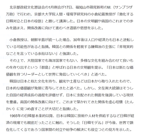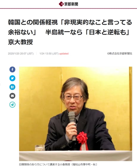 小倉教授は、朝鮮半島が統一した場合、30年後は人口や経済力も日本と逆転している可能性があると指摘。韓国との関係を軽視する嫌韓派の主張に「非現実的なことを言っている余裕はない」と強調した。