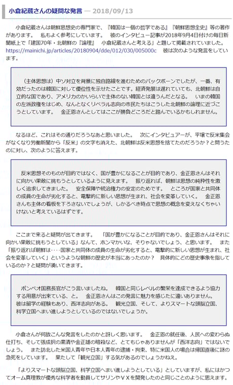 小倉氏は「韓流ブーム」を吹聴し、共産主義者である文在寅大統領の下で韓国版KGBをつくって赤化しつつある韓国を必死で盛り立てようとしているが、すでに韓国はレッドチームであり、統一は「赤化統一」になるので、「経済の大発展」など「非現実的」なことこの上ない。