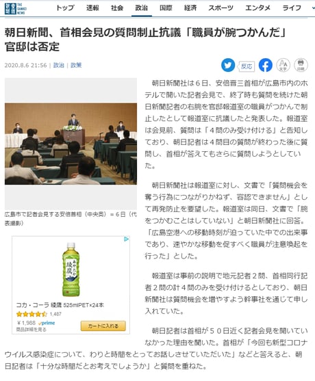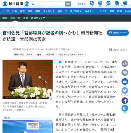 朝日新聞社は6日、広島市内のホテルで開かれた安倍晋三首相の記者会見で、追加質問をしようとした同社の記者が首相官邸報道室の職員から右腕をつかまれたとして、報道室に抗議した。同社によると、予定されていた4問目の質問が終わった後、記者が座ったまま右手を挙げて「総理、まだ質問があります」などと呼びかけたところ、報道室職員が質問を制止しながら短時間、右腕をつかんだという。