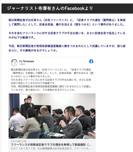 首相の記者会見でルール違反を咎められて「暴行された」と騒いでいる朝日新聞は、記者クラブのルール違反をした書生フリーランスに暴行を加えた過去がありました。