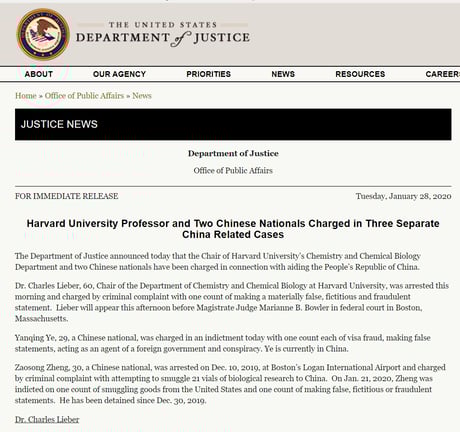 ・Harvard University Professor and Two Chinese Nationals Charged in Three Separate China Related Cases