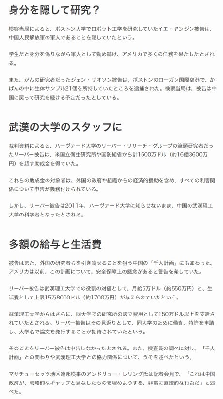 (ハーバード大学教授と2人の中国人をウイルスの密輸等の3つの別個の中国関連事件で起訴)