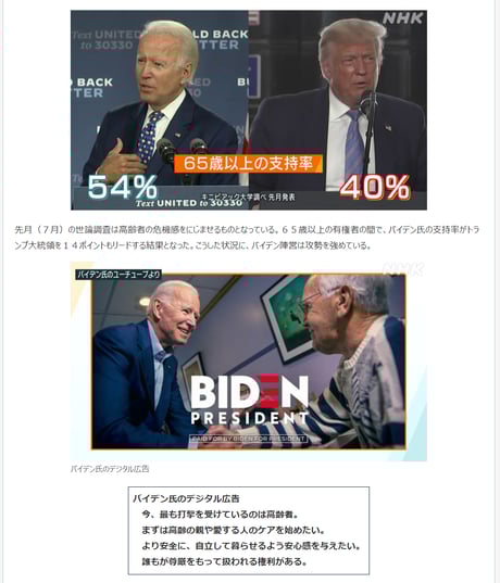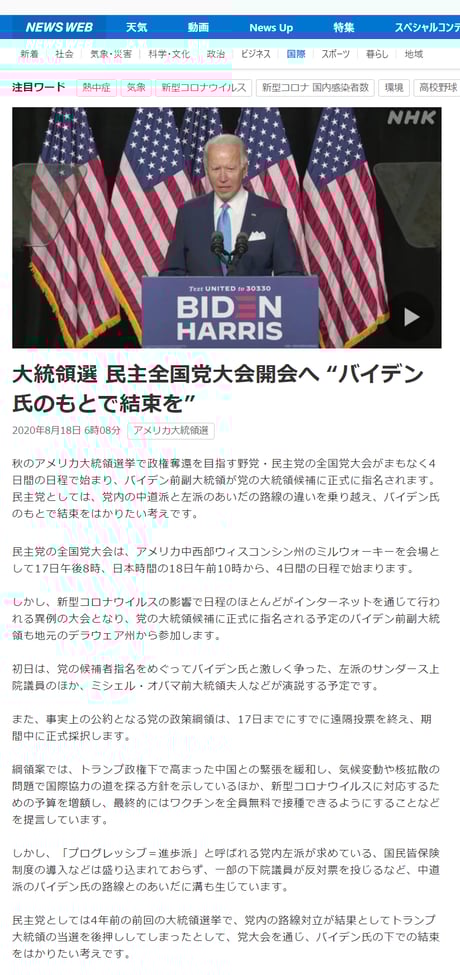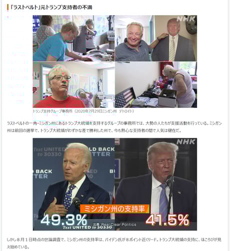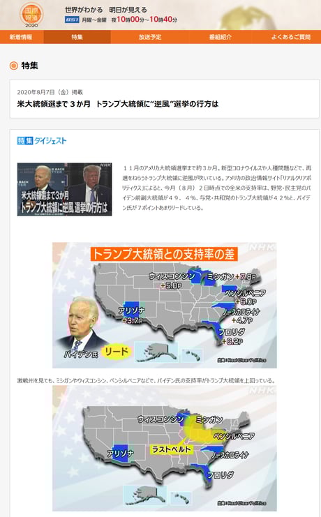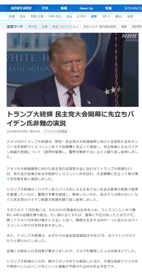 民主党支持者からも懸念が出ているハリス副大統領候補を持ち上げたり、同日のNHK NEWS WEBも、反トランプ・民主党応援の著しく片寄った記事構成になっている。