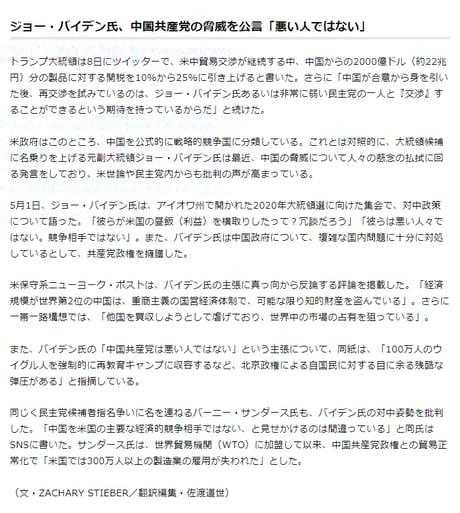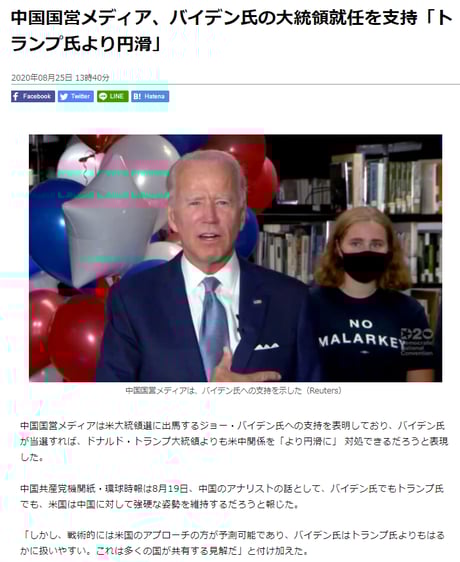 バイデン候補が「オバマ政権を引き継ぐ」と表明しているにも拘わらず、「アメリカの対中政策は民主党政権になってもトランプ政権と代わらない」と虚偽報道。