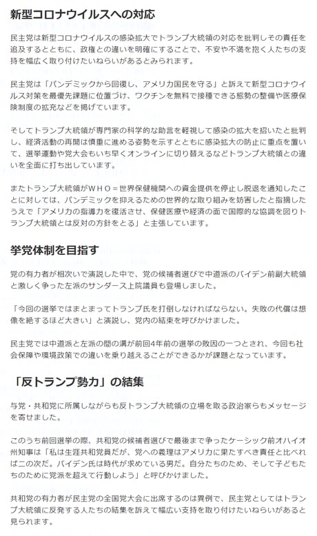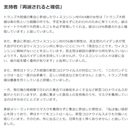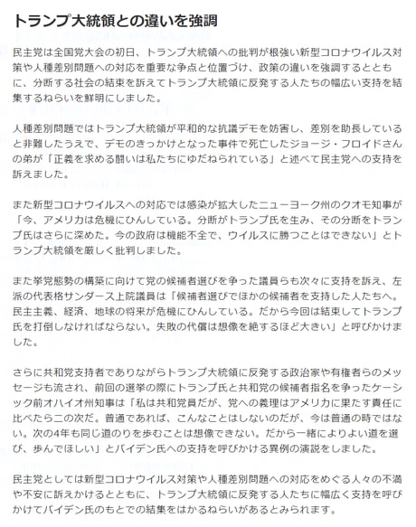 民主党候補の支持者ばかりに焦点を当て、コロナによる経済失速までトランプ大統領の失政のように印象操作。