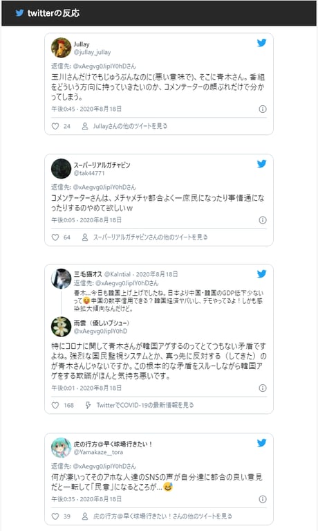 青木さんや玉川さんが「優秀な俺たちメディアですら間違うことがあるのにアホな国民がSNSなんて使えばそりゃデマや誹謗中傷で溢れるよな。お前らリテラシー持てよ。」と言ってるように聞こえてしまうのですが、あれだけのデマを連発してきたこの番組(モーニングショー)のリテラシーは底辺ですよね。 pic.twitter.com/mkzneD2vPc