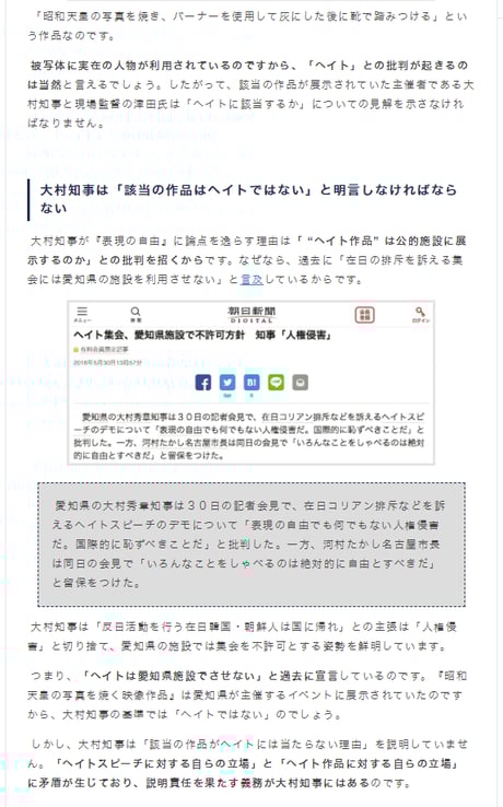 私はこの問題を昨年から事(こと)あるごとに取り上げてきた。新聞は展示されていた少女像のみを取り上げ、同展に非難が殺到したのは、一部の右翼や反韓勢力が「少女像の展示に反発して起こったものだ」と印象操作する報道をくり返してきたからだ。