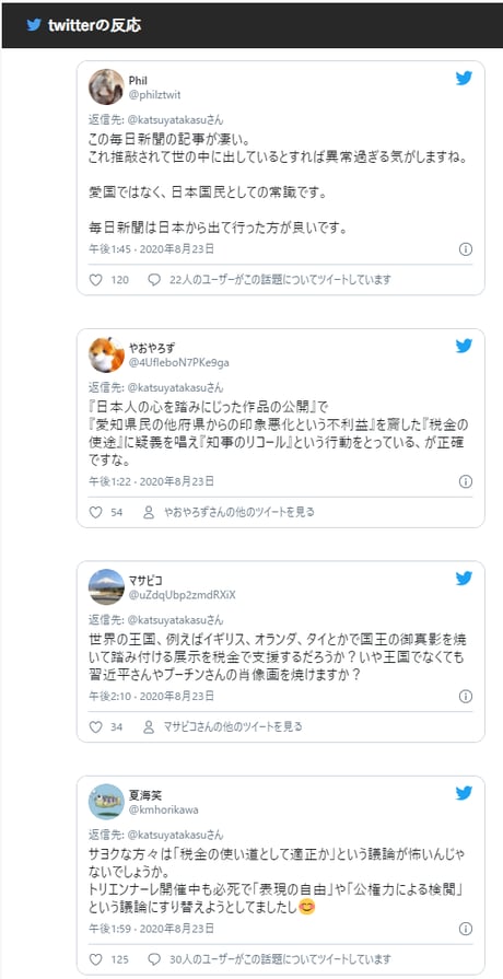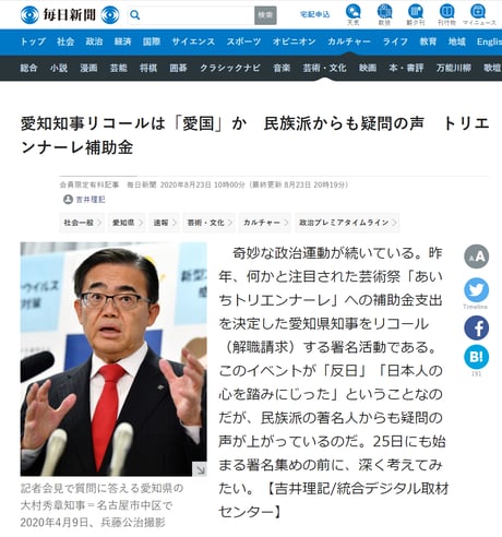 奇妙な政治運動が続いている。昨年、何かと注目された芸術祭「あいちトリエンナーレ」への補助金支出を決定した愛知県知事をリコール(解職請求)する署名活動である。このイベントが「反日」「日本人の心を踏みにじった」ということなのだが、民族派の著名人からも疑問の声が上がっているのだ。25日にも始まる署名集めの前に、深く考えてみたい。【吉井理記/統合デジタル取材センター】