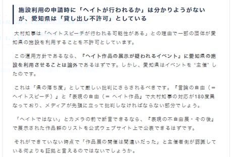 「愛知トリエンナーレ『表現の不自由展』のヘイト作品展示への公金投入」と「知事リコール」について