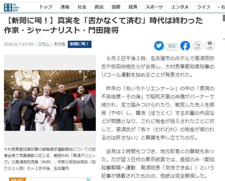 各紙は申し合わせたように「少女像の展示に批判が殺到」と報じ、問題を矮小化(わいしょうか)した。そして今回はリコール運動自体を黙殺したのだ。この運動に対して大阪の吉村洋文知事や名古屋の河村たかし市長まで賛意を表明するなど、ニュース性は高い。それでも新聞は「報道しない自由」を行使したのである。